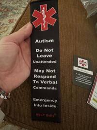 The front of the seat belt cover, which reads “Autism. Do not leave unattended. May not respond to verbal commands. Emergency info inside.â€
